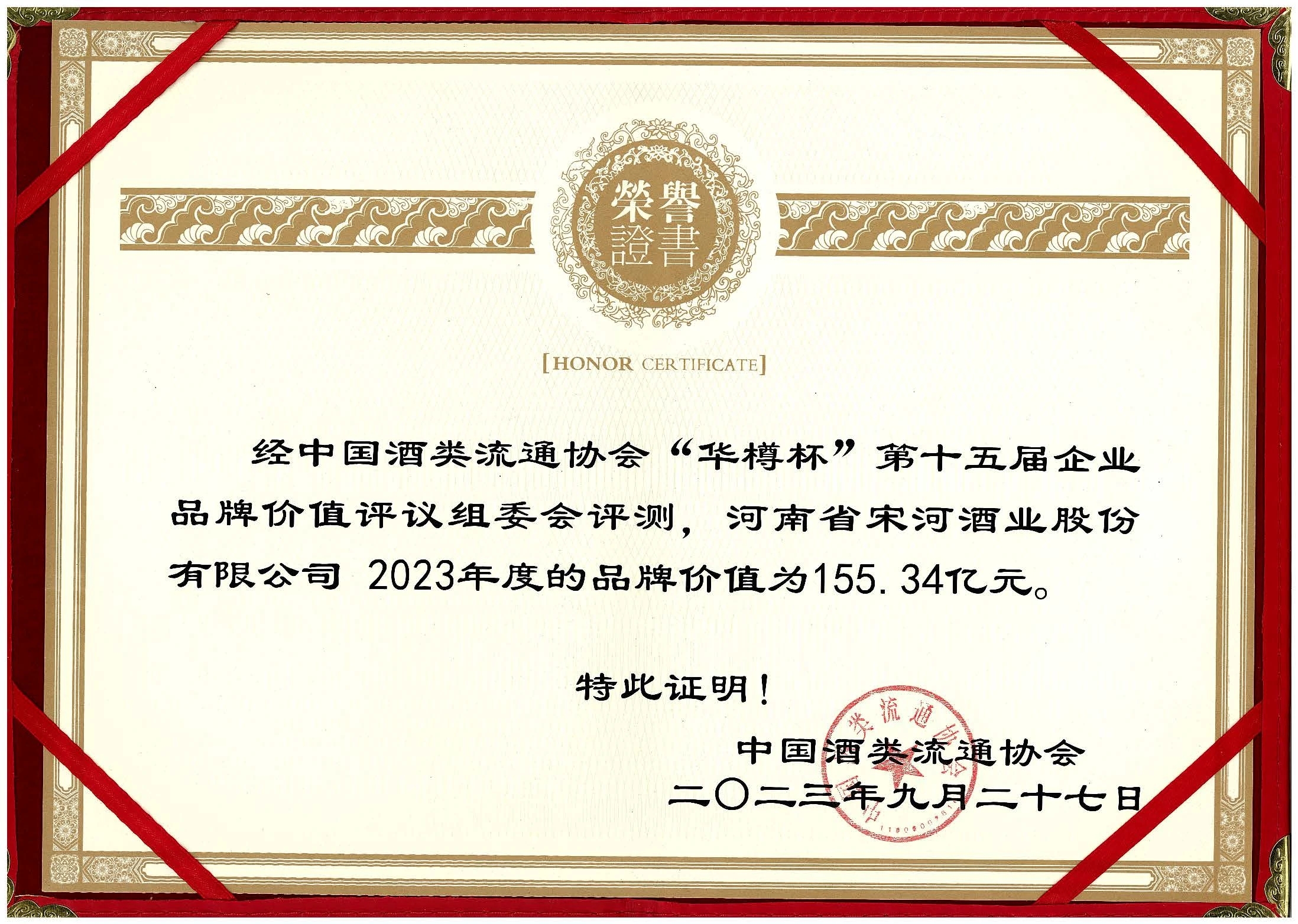 9月27日,第十五屆中國酒類企業(yè)品牌價值發(fā)布會在北京國家會議中心隆重舉辦。經(jīng)企業(yè)品牌價值評議委員會評測,宋河酒業(yè)2023年度的品牌價值為155.34億元。作為河南唯一的濃香型中國名酒品牌,宋河酒業(yè)同時在會上斬獲多項殊榮。