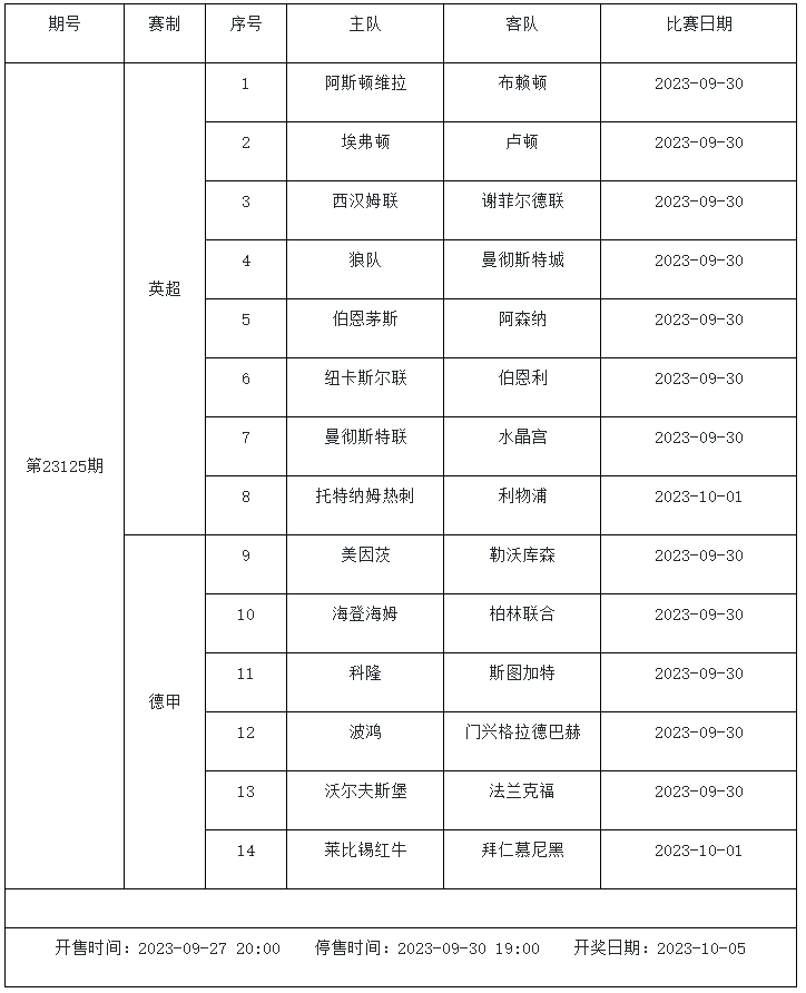 萊比錫周中德國杯3:2擊敗韋恩,各項賽事取得6連勝,出色的防守能力是萊比錫在今夏大失血之后依舊能保持競爭力的關(guān)鍵。在德甲賽季初的5場比賽里萊比錫打進14球僅失4球,是目前德甲失球最少的球隊之一,以亨利西斯+西馬坎+盧科巴+勞姆的后防組合功不可沒。拜仁上輪聯(lián)賽7:0血洗波鴻,凱恩上演帽子戲法,目前打進7球排在德甲射手榜第2的位置。目前隊內(nèi)主力前腰穆西亞拉因傷無法出戰(zhàn),舒波莫廷替代他的位置,和科曼、薩內(nèi)以及凱恩梳理球隊攻擊線,球隊的替補席上還有穆勒、格雷茨卡和格拉布里等眾多進攻好手,球隊主帥圖赫爾能夠打出的牌還有不少。兩支球隊在本賽季初的德國超級杯中有過交手,當(dāng)時拜仁以0:3的比分不敵萊比錫,當(dāng)時凱恩還未加入球隊,并非最強陣容出戰(zhàn),經(jīng)歷了多場比賽的磨合之后,拜仁有信心能夠復(fù)仇對手全身而退。足球彩票勝負(fù)游戲(14場和任選9場)第23125期賽程: