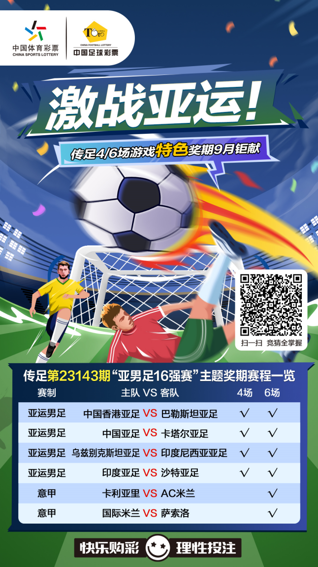 杭州亞運(yùn)會(huì)男足16強(qiáng)出爐,傳足4/6場(chǎng)游戲第23143期競(jìng)猜對(duì)象為4場(chǎng)亞運(yùn)男足1/8決賽賽事和2場(chǎng)意甲賽事,分別為中國香港亞足VS巴勒斯坦亞足、中國亞足VS卡塔爾亞足、烏茲別克斯坦亞足VS印度尼西亞亞足、印度亞足VS沙特亞足、卡利亞里VSAC米蘭和國際米蘭VS薩索洛。