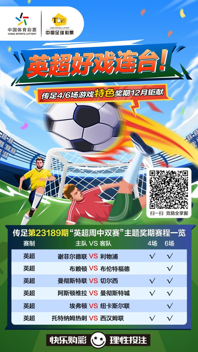 第23189期傳足特色獎期已經(jīng)于12月3日20:00開售,將于12月6日22:00停售,并于12月8日開獎。其中謝菲爾德聯(lián)VS利物浦、曼聯(lián)VS切爾西、阿斯頓維拉VS曼城和熱刺VS西漢姆聯(lián)為4場進(jìn)球游戲競猜賽事。