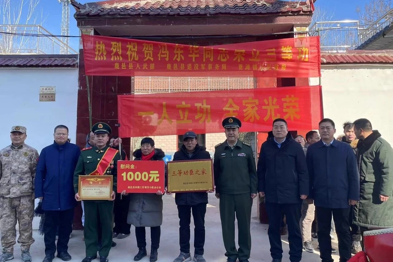 喜報(bào)傳佳音,榮耀滿(mǎn)門(mén)庭。為進(jìn)一步弘揚(yáng)新時(shí)代擁軍優(yōu)屬光榮傳統(tǒng),增強(qiáng)軍人榮譽(yù)感和軍屬自豪感,1月22日,鹿邑縣人武部領(lǐng)導(dǎo)帶領(lǐng)縣人武部、縣退役軍人事務(wù)局及賈灘鎮(zhèn)黨委政府相關(guān)負(fù)責(zé)同志及現(xiàn)役軍人所在部隊(duì)代表一行人,敲鑼打鼓來(lái)到榮立三等功的現(xiàn)役軍人馮東華同志家中,送上立功喜報(bào)和慰問(wèn)品,向立功軍人及家屬表達(dá)親切的關(guān)懷和衷心的祝賀。
