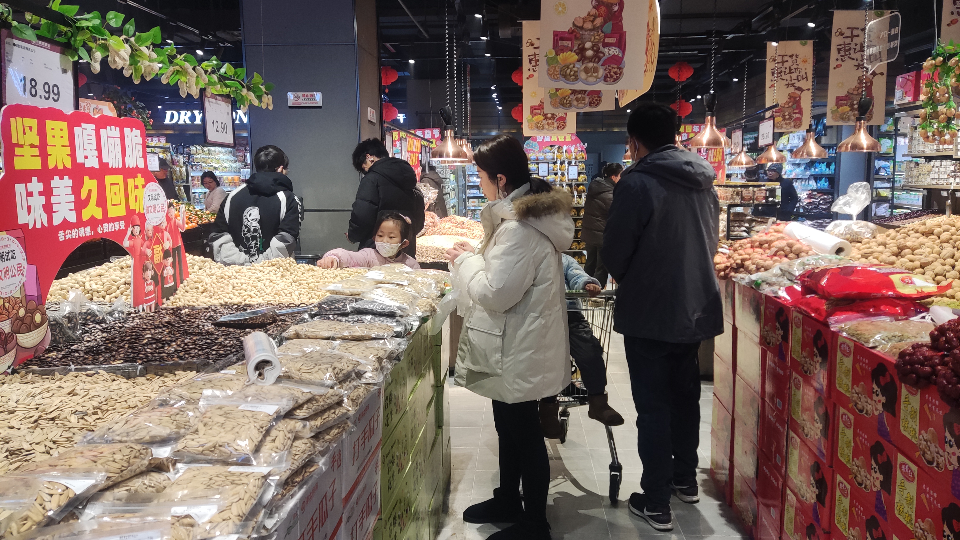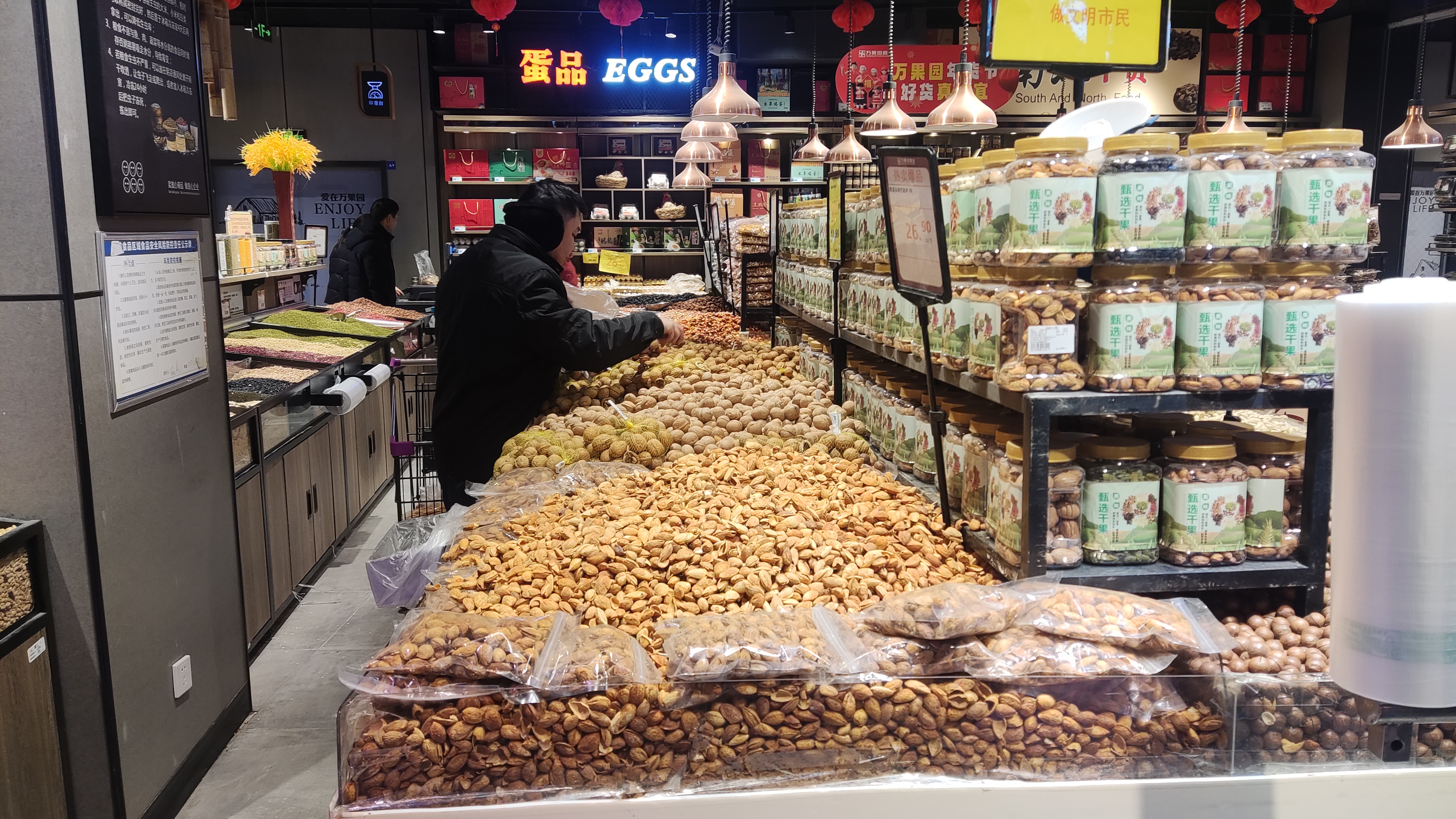核桃、巴旦木、夏威夷果、碧根果……市民陳女士拎著一大包商品滿載而歸?!俺詧怨】涤逐B(yǎng)生,家里人都喜歡吃,過年期間一家人邊聊天邊吃堅果,滿滿年味。”陳女士說,組合裝小袋堅果比較劃算,里面有剝好的杏仁、核桃、腰果等,價格不貴,方便實惠。