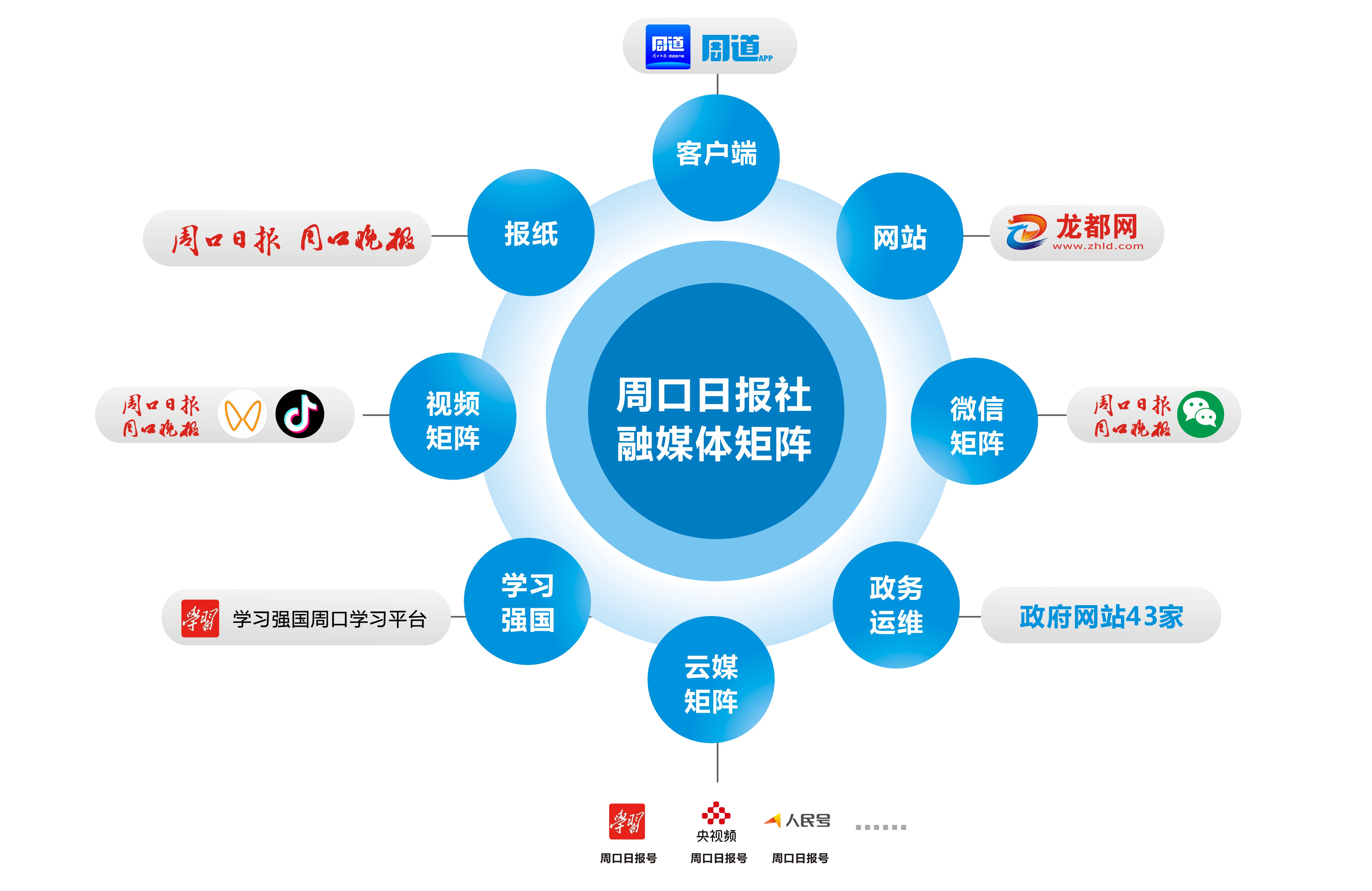 周口日報(bào)社始終堅(jiān)持“移動(dòng)優(yōu)先 內(nèi)容為王 導(dǎo)向?yàn)榛?創(chuàng)新為要”的發(fā)展方向,從體制機(jī)制、隊(duì)伍建設(shè)、采編創(chuàng)新、服務(wù)優(yōu)先、經(jīng)營轉(zhuǎn)型等多方面持續(xù)發(fā)力,不斷深化媒體融合發(fā)展。已形成涵蓋《周口日報(bào)》,《周口晚報(bào)》,龍都網(wǎng),周道客戶端,官方微信號(hào)、微博號(hào)、視頻號(hào)、抖音號(hào),學(xué)習(xí)強(qiáng)國周口學(xué)習(xí)平臺(tái)、政務(wù)運(yùn)維等12大門類18個(gè)主體的立體傳播矩陣,托管運(yùn)維政府網(wǎng)站43家,用戶總數(shù)逾千萬。對(duì)外宣傳上,周口日報(bào)社還在學(xué)習(xí)強(qiáng)國客戶端、人民日報(bào)客戶端、央視頻客戶端等多個(gè)第三方平臺(tái)開設(shè)周口日報(bào)號(hào),組成網(wǎng)絡(luò)云媒矩陣,形成了全方位、立體化、多角度展示周口形象的全媒體傳播新格局。