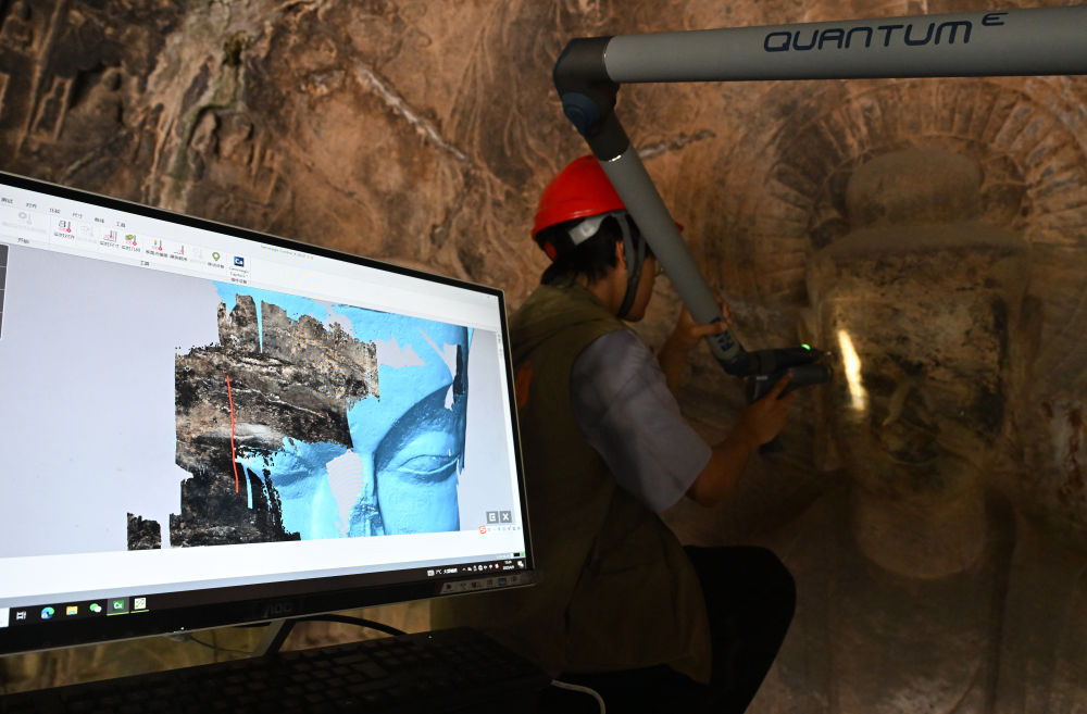 2025年4月9日,武漢大學文化遺產智能計算實驗室團隊成員在魏字洞使用關節(jié)臂掃描儀對佛像進行數字化掃描。圖片來源新華社