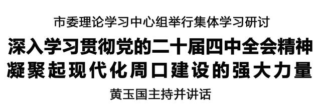 本報(bào)訊 (記者 王艷) 11月8日,市委理論學(xué)習(xí)中心組舉行集體學(xué)習(xí)研討,深入學(xué)習(xí)貫徹黨的二十屆四中全會(huì)精神,示范帶動(dòng)全市各級(jí)黨組織和廣大黨員干部興起學(xué)習(xí)貫徹?zé)岢?,凝聚起現(xiàn)代化周口建設(shè)的強(qiáng)大力量。市委書(shū)記黃玉國(guó)主持并講話。