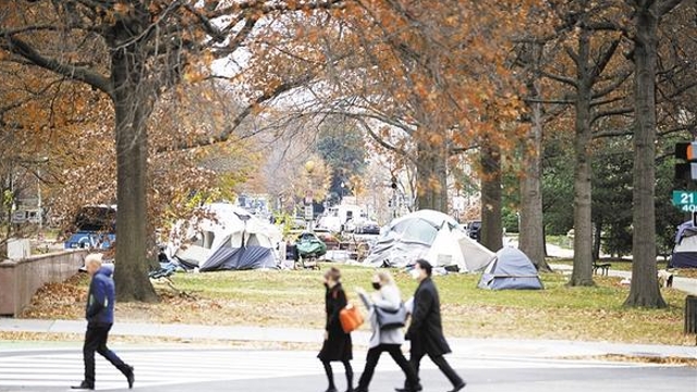 12月8日,在美國華盛頓,行人經(jīng)過無家可歸者居住的帳篷?!?a href="http://m.hotmeol.com/content/2021-12/11/content_962080.html" target="_blank" >[詳細(xì)]