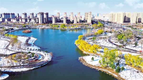 12月13日,扶溝縣人民公園白雪皚皚、天藍水清、柳樹正黃,與遠處聳立的高樓,共同構(gòu)成一幅絕美畫卷,成為市民休閑散步的好去處。