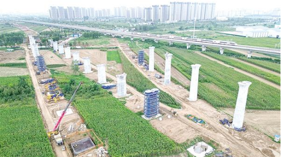 9月21日上午,在平漯周高鐵接入高鐵周口東站的施工現(xiàn)場(chǎng),中鐵十局的工人正緊張施工。據(jù)了解,該項(xiàng)目將通過(guò)新建三條軌道接入高鐵周口東站,屆時(shí),高鐵周口東站將升級(jí)成為四條軌道并行的高鐵樞紐站。