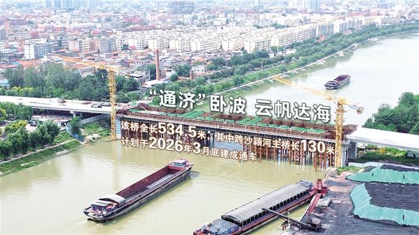 9月16日上午,建設中的項城通濟大道橋臥波于沙潁河之上,貨船從30米寬的通航孔緩緩馳過,保障豫貨出海。