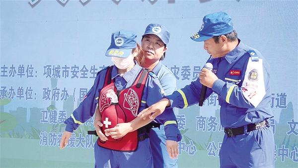 6月16日,項城市舉行“安全宣傳咨詢?nèi)铡被顒??;顒釉O(shè)置警示教育片展播、應(yīng)急技能演示、救援裝備展示、安全咨詢等環(huán)節(jié)。圖為項城應(yīng)急藍(lán)天救援隊3名隊員演示海姆立克急救法操作流程。
