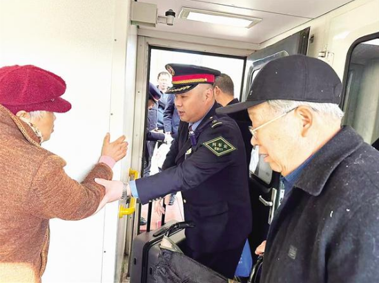 11月22日,由周口開往上海的K1505次列車??宽棾钦緯r,列車長潘玉龍在站臺發(fā)現(xiàn)一位乘坐輪椅的旅客李女士,便主動上前提供幫助。