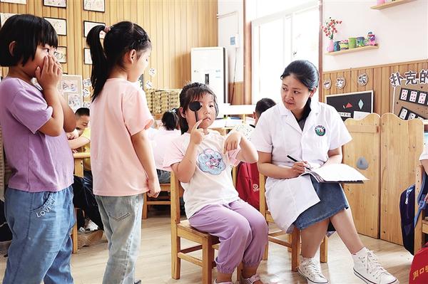 5月19日,扶溝縣中醫(yī)院眼科醫(yī)務(wù)人員來到扶溝縣直幼兒園為小朋友檢查視力。近日,扶溝縣多家幼兒園開展“愛眼護(hù)眼從小做起”主題活動(dòng),邀請(qǐng)醫(yī)務(wù)人員為小朋友講解眼科知識(shí),并為小朋友進(jìn)行視力檢查。