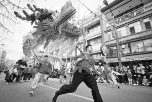 ▲2月22日, 在加拿大溫哥華, 巡游隊(duì)伍在春節(jié)狂歡游行中表演舞龍。當(dāng)日,溫哥華唐人街舉行第42屆春節(jié)大游行,本年游行的隊(duì)伍多達(dá)80支,參加表演人數(shù)超過(guò)4000人,規(guī)模是歷屆之最。游行共吸引近10萬(wàn)人沿途觀看。