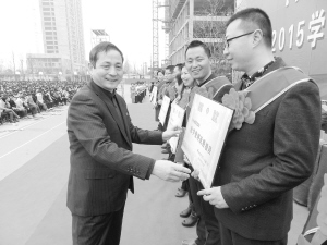 3月8日上午,淮陽一高萬余名師生在學(xué)校操場隆重舉行新學(xué)期表彰大會。大會回顧了2014~2015學(xué)年第一學(xué)期的各項工作,對感動校園學(xué)生、優(yōu)秀班主任、優(yōu)秀員工、優(yōu)質(zhì)課教師等24個項目近500人次進行了表彰?;搓柨h有關(guān)領(lǐng)導(dǎo)及淮陽一高全體師生參加了本次表彰大會。圖為王業(yè)生校長為獲獎人員頒發(fā)獎狀。(豆紀(jì)鋒 攝)