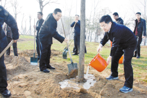 3月12日,皇甫立新等在植樹點(diǎn)植樹。當(dāng)日,沈丘縣四個(gè)班子領(lǐng)導(dǎo)來到縣城東環(huán)路綠化帶植樹點(diǎn),與當(dāng)?shù)厝罕娨黄饟]鍬鏟土,參加義務(wù)植樹活動(dòng)。(記者 韋偉  通訊員 艾長青)