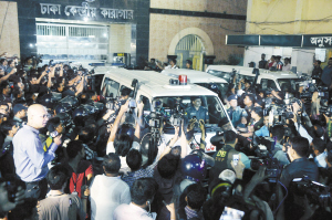 孟加拉國反對黨領(lǐng)導(dǎo)人被執(zhí)行死刑      4月11日,在孟加拉國首都達卡,人們圍住運送卡馬魯扎曼尸體的救護車。當晚,孟加拉國反對黨伊斯蘭大會黨領(lǐng)導(dǎo)人卡馬魯扎曼在首都達卡中央監(jiān)獄被執(zhí)行死刑。新華社發(fā)
