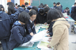 該校將課堂名字定為“求真大課堂”,以“真”字作為學校一切教育教學和管理的衡量標準。朱貴華說,求真就是要真教、真學、真嚴、真愛、真實、真會。為提高課堂教學效果,該??偨Y出一套獨特的課堂教學方法——“七音和鳴”。分管教學工作的副校長徐其運用“1234567”,即哆來咪發(fā)唆拉西”來詮釋“七音和鳴”法。“1”就是一個學習目標;“2”就是提前兩分鐘進班,布置2個任務(出示目標、檢查學情);“3”就是準備3個本子,即學情檢效本、跟蹤本、糾錯本;“4”是4個維度考評,即高速度、準確度、干凈度、參與度;“5”是5個跟蹤,即節(jié)跟蹤、日跟蹤、周跟蹤、月跟蹤、學期跟蹤,堅持“抓緊跟蹤不放松、我在文昌必成功”的教育信念;“6”是6個環(huán)節(jié),即激情導入、自研自探、合作探究、展示質疑、師生點評、當堂檢測;“7”是7個評價,即教師的教案、學生的學案、練案、觀課記錄的每周業(yè)務評價及對學生的即時性、激勵性、長效性評價。