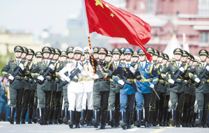 5月9日,在俄羅斯首都莫斯科紅場,中國人民解放軍三軍儀仗隊方陣行進在閱兵式上。俄羅斯9日在莫斯科舉行盛大慶典,紀念衛(wèi)國戰(zhàn)爭勝利70周年。新華社發(fā)