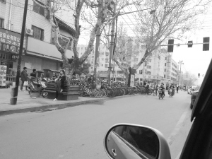 圖② 五一路與交通大道口東北角人行道成了“存車場(chǎng)”,行人只能繞行快車道。