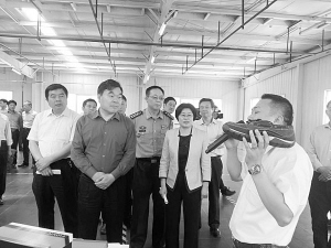 市長(zhǎng)劉繼標(biāo)帶領(lǐng)第二觀摩組在扶溝縣玖弘鞋業(yè)有限公司生產(chǎn)車間觀摩。