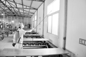 當(dāng)日下午4時許,在該校食堂內(nèi),記者看到,消殺人員正在噴灑滅蚊蠅的藥物。墻壁、天花板、地面、餐桌……食堂的每個角落都被他們仔細(xì)地噴灑了一遍。