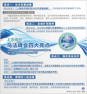 烏法,見證金磚國(guó)家新開發(fā)銀行籌備工作全面展開,應(yīng)急儲(chǔ)備安排正式啟動(dòng);見證上合組織成立14年來(lái)首次擴(kuò)員,印度和巴基斯坦加入上合組織的程序啟動(dòng),白俄羅斯成為觀察員國(guó),阿塞拜疆、亞美尼亞、柬埔寨、尼泊爾成為對(duì)話伙伴國(guó)……新興和發(fā)展中國(guó)家伙伴關(guān)系日益密切。