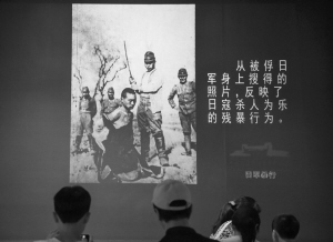 日軍虐待和殘殺戰(zhàn)俘的罪行,也展示在主題展覽中。有一組照片來自美國《生活》雜志,照片顯示日軍軍官先用劍刺殺一名中國戰(zhàn)俘,隨后,日軍士兵用刺刀繼續(xù)進行“刺殺練習”,其殘忍和野蠻令人發(fā)指。