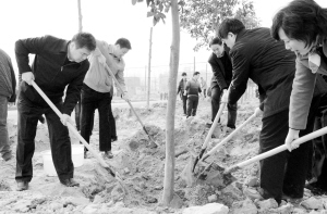 本報(bào)訊 春回大地好風(fēng)光,美化家園播綠忙。3月12日是我國(guó)第37個(gè)植樹(shù)節(jié),當(dāng)天上午,市委書記徐光、市長(zhǎng)劉繼標(biāo)、市人大常委會(huì)主任李洪民、市政協(xié)主席穆仁先等市領(lǐng)導(dǎo)來(lái)到川匯區(qū)義務(wù)植樹(shù)點(diǎn),與近200名干部群眾一起揮锨培土,拉開(kāi)了我市今年義務(wù)植樹(shù)造林的序幕,用實(shí)際行動(dòng)為“美麗周口”再添新綠。
